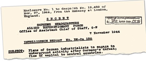 Dokument wywiadu wojskowego Stanów Zjednoczonych, zatytułowany „Raport Czerwonego Domu", datowany na 7 listopada 1944 r., opisuje, w jaki sposób niemieckim przemysłowcom powiedziano, aby ewakuowali wszystkie dostępne aktywa do krajów neutralnych przy użyciu tysięcy firm fasadowych zaprojektowanych w celu ukrycia masowego odpływu nazistowskiego kapitału i surowce przemysłowe.