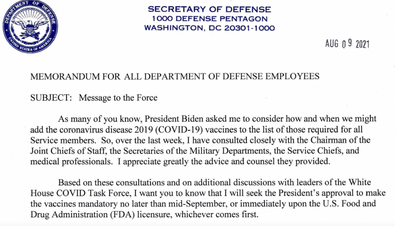 W memorandum wydanym w poniedziałek, sekretarz obrony Biden, Lloyd Austin, ogłosił, że zamierza wymagać szczepienia przeciwko COVID-19 dla wszystkich członków służby do połowy września lub natychmiast, jeśli jakakolwiek szczepionka COVID zostanie zatwierdzona przez FDA (obecnie szczepionki są dopuszczone tylko w nagłych wypadkach).
