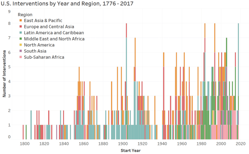 Projekt interwencji wojskowej dodał: „Wraz z końcem ery zimnej wojny spodziewalibyśmy się, że Stany Zjednoczone zmniejszą swoje interwencje wojskowe za granicą, zakładając mniejsze zagrożenia i interesy. Ale te wzorce ujawniają coś przeciwnego – Stany Zjednoczone zwiększyły swoje zaangażowanie wojskowe za granicą".