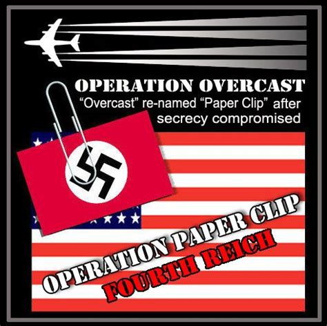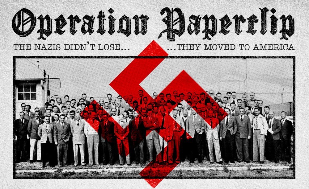 Wojsko USA zgromadziło nazistowskich naukowców i sprowadziło ich do Ameryki. Pierwotnie zamierzał jedynie przesłuchać ich i odesłać do Niemiec. Ale kiedy zdał sobie sprawę z zakresu wiedzy i doświadczenia naukowców, Departament Wojny uznał, że wysyłanie naukowców do domu byłoby marnotrawstwem. Po odkryciu latających dysków ( foo fighterów ), broni cząsteczkowej/laserowej w niemieckich bazach wojskowych, Departament Wojny zdecydował, że NASA i CIA muszą kontrolować tę technologię oraz nazistowskich inżynierów, którzy pracowali nad tą technologią.