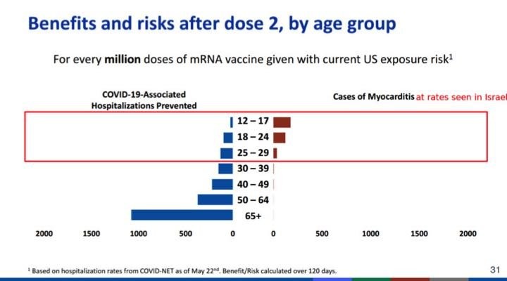 Na spotkaniu ACIP rozważył liczby i dane, które twierdziły, że rozważają korzyści i szkody wynikające z „drugiej dawki" szczepionek mRNA w tej grupie wiekowej. Jednak w rzeczywistości scenariusze przedstawione przez CDC porównywały ryzyko i korzyści dla młodych ludzi z braku szczepień w ogóle ze scenariuszem, w którym otrzymali dwie szczepionki.