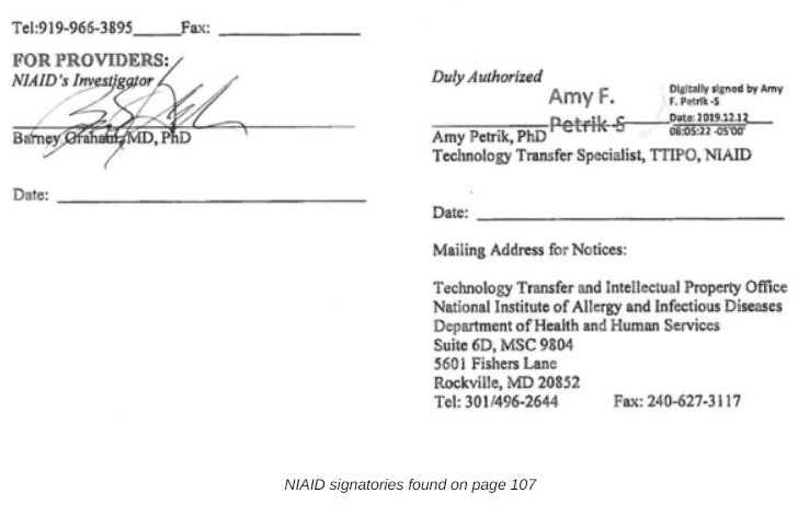 Umowę podpisało również dwóch przedstawicieli NIAID, w tym dr Amy F. Petrik, specjalista ds. transferu technologii, która podpisała umowę 12 grudnia 2019 r. o godzinie 8:05. Drugim sygnatariuszem był dr Barney Graham, badacz NIAID, ale podpis ten był niedatowany.
