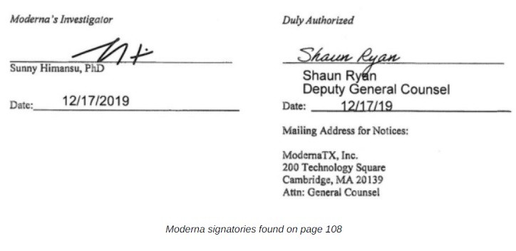 Ostatnimi sygnatariuszami porozumienia byli Sunny Himansu, śledczy Moderny i Shaun Ryan, zastępca głównego radcy prawnego Moderny. Oba podpisy zostały złożone 17 grudnia 2019 r.