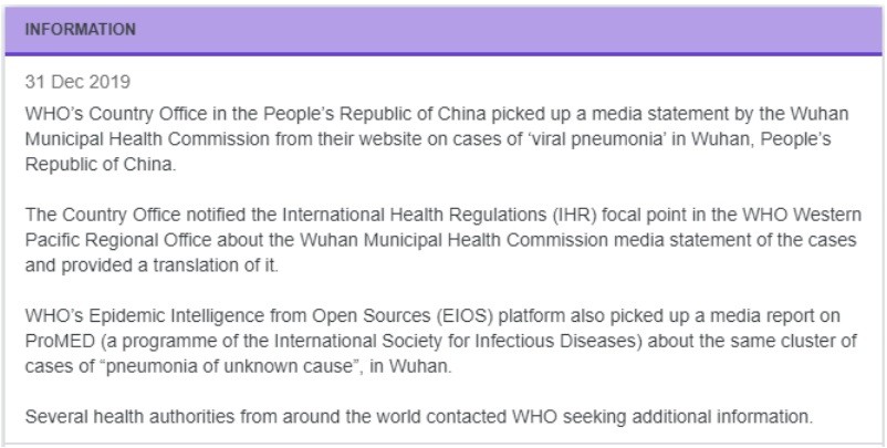 Wszystkie te podpisy zostały złożone, zanim pojawiła się jakakolwiek wiedza o rzekomym pojawieniu się nowego koronawirusa. Dopiero 31 grudnia 2019 r. Światowa Organizacja Zdrowia (WHO) dowiedziała się o rzekomej grupie przypadków wirusowego zapalenia płuc w Wuhan w Chinach. Ale nawet w tym momencie nie ustalili, że winny jest rzekomy nowy koronawirus, zamiast tego stwierdzili, że zapalenie płuc miało „nieznaną przyczynę".