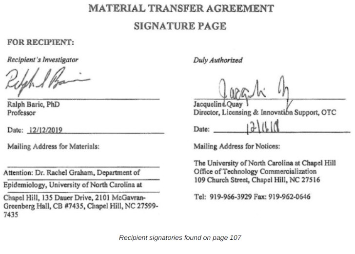 Umowa o transferze materiałów została podpisana 12 grudnia 2019 r. przez dr Ralpha Barica z Uniwersytetu Karoliny Północnej w Chapel Hill, a następnie podpisana 16 grudnia 2019 r. przez Jacqueline Quay, dyrektor ds. Wsparcia licencjonowania i innowacji na Uniwersytecie Karoliny Północnej.