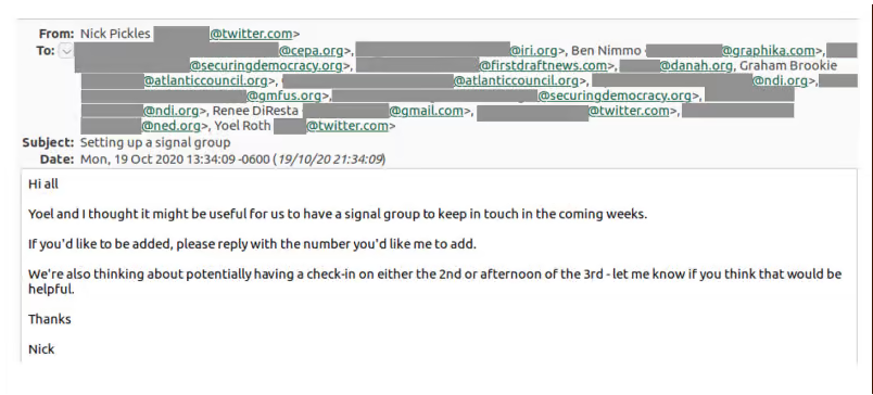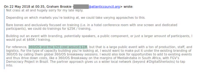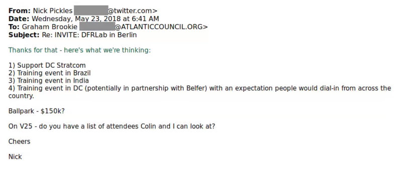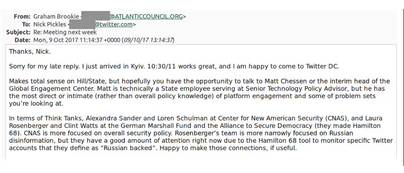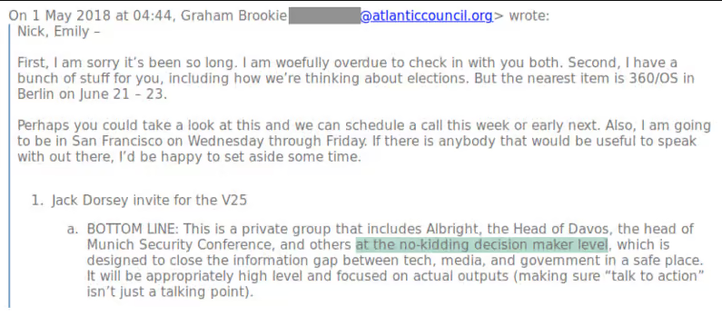 Podobna korespondencja do i z DFRLabs i Twittera przedstawiała wczesne wysiłki zmierzające do połączenia grup partnerskich, które tradycyjnie służyły sobie nawzajem jako psy stróżujące. Być może nawet bardziej niż spotkania Światowego Forum Ekonomicznego w Davos lub zgromadzenia Instytutu Aspen w USA, konfabulacje Atlantic Council 360/OS są tak rozległym portretem kompleksu cenzury i przemysłu, jak znaleźliśmy zebrane w jednym miejscu.