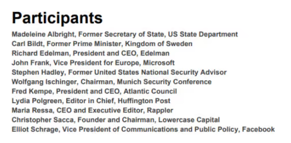 Wygląda na to, że niemiecka Angela Merkel była ostatecznie poza zasięgiem, ale wielu innych uczestniczyło w tym zakulisowym spotkaniu na temat „dezinformacji". Kim oni są?