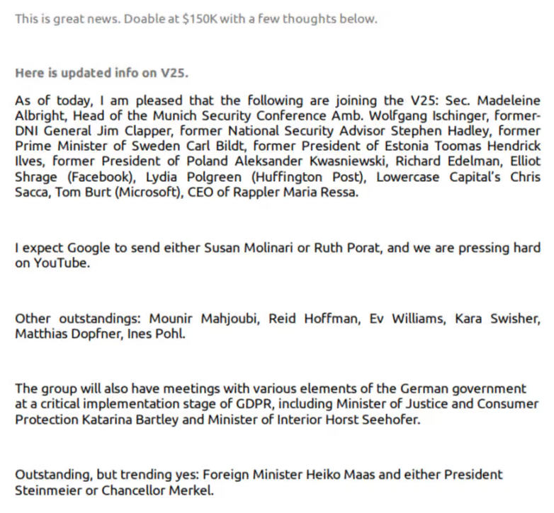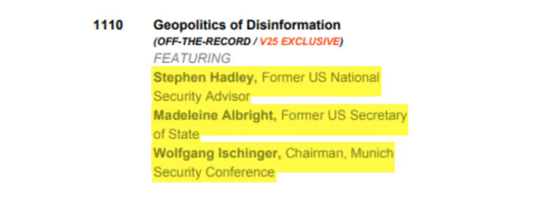 TwitterFiles #20 ujawniło niektóre z wydarzeń 360/0S Digital Forensic Lab z 2018 r., w których wzięli udział przywódcy wojskowi, organizacje praw człowieka, Huffington Post , Facebook i Twitter, Edelman (największa na świecie firma PR), szef Monachijskiej Konferencji Bezpieczeństwa , szef Światowego Forum Ekonomicznego (Borge Brende), były prezydent, premier i szef CIA, szef wywiadu BellingCat i przyszła laureatka Pokojowej Nagrody Nobla, Maria Ressa, wszystko po to, by zwalczać „dezinformację". Teraz możemy ujawnić więcej.