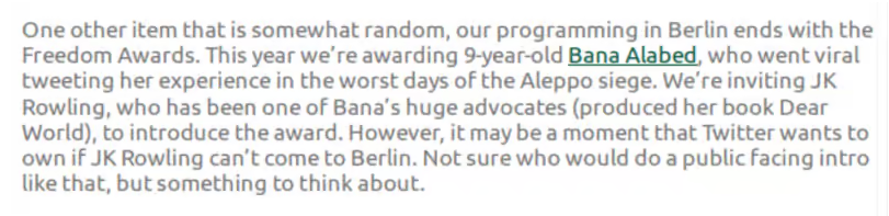 JK Rowling została również zaproszona do wręczenia nagrody, choć wygląda na to, że ostatecznie jej się to nie udało: