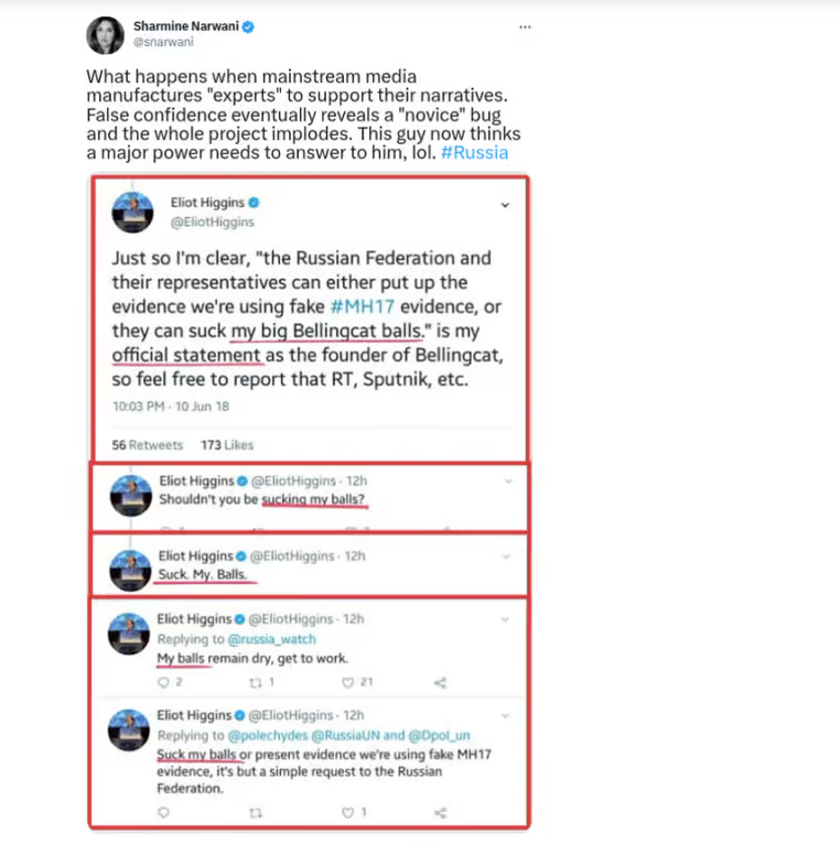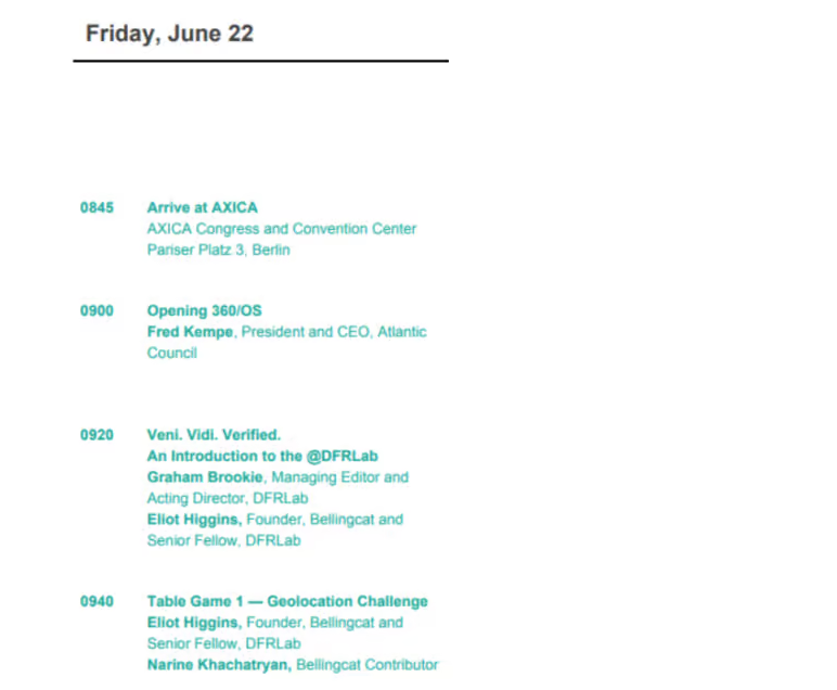 Były pracownik DFRLabs i założyciel firmy Bellingcat, Eliot Higgins, jest również zapraszany na zamknięte sesje z byłym szefem CIA, byłym premierem i prezydentem. Jak zachować odpowiedzialność władzy, gdy jesteś w tym samym przytulnym klubie? Ten motyw przewija się przez cały czas. Bellingcat jest również często prezentowany na sesjach publicznych: