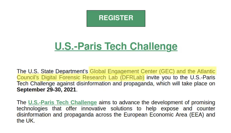 Global Engagement Center zostało utworzone w ostatnim roku prezydentury Baracka Obamy, poprzez połączenie dekretu wykonawczego i ponadpartyjnego przydziału Kongresu , kierowanego przez republikanina z Ohio Roba Portmana i demokratę z Connecticut, Chrisa Murphy'ego. GEC była i pozostaje praktycznie nieznana, ale raporty w plikach na Twitterze i przez takie placówki, jak Washington Examiner ujawniły, że jest znaczącym finansowym i logistycznym zwolennikiem inicjatyw „antydezinformacyjnych".