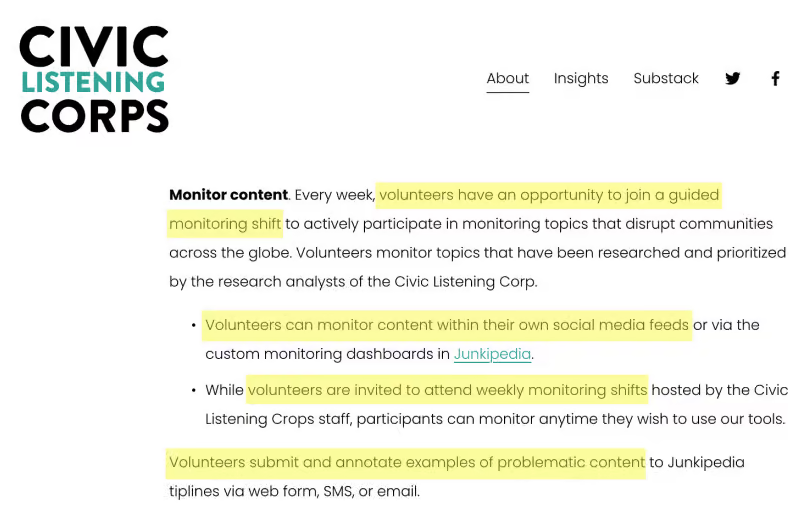 Partner Virality Project o nazwie Algorithmic Transparency Initiative (projekt Narodowego Kongresu Obywatelstwa) poszedł dalej. Ich inicjatywa Junkipedia miała na celu rozwiązanie „problematycznych treści" poprzez „automatyczne gromadzenie danych" z „zamkniętych aplikacji do przesyłania wiadomości" oraz budowanie podobnych do Stasi „ obywatelskich korpusów nasłuchujących ", które w ostatnich latach przyjęły prawdziwie złowrogie brzmienie misja.