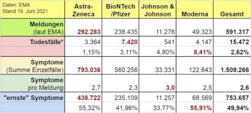 Portal „Health Impact News" na własnym koncie zestawił przy wsparciu subskrybenta z Europy „każdą reakcję z objawami i zgonami". Od czasu opublikowania danych inni potwierdzili dane. Udało nam się również zweryfikować liczby. Do 19 czerwca 2021 r. – około pół roku po rozpoczęciu szczepień – EMA zarejestrowała: