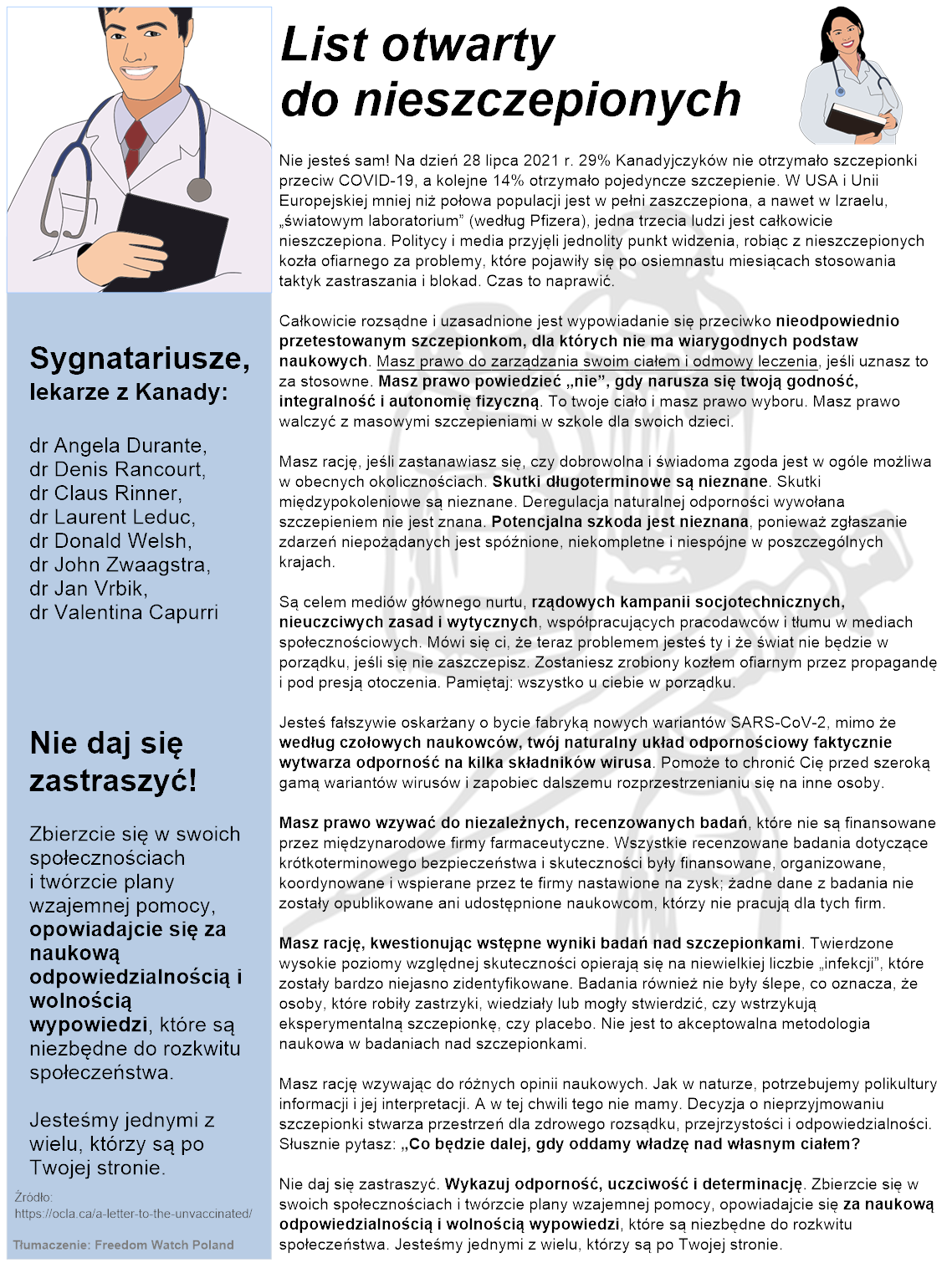 Całkowicie rozsądne i uzasadnione jest powiedzenie „nie" niewystarczająco przetestowanym szczepionkom, dla których nie ma wiarygodnej nauki. Masz prawo domagać się opieki nad swoim ciałem i odmówić leczenia, jeśli uznasz to za stosowne. Masz rację mówiąc „nie" naruszeniu swojej godności, integralności i autonomii cielesnej. To twoje ciało i masz prawo wyboru. Masz rację, walcząc o swoje dzieci przeciwko ich masowym szczepieniom w szkole.