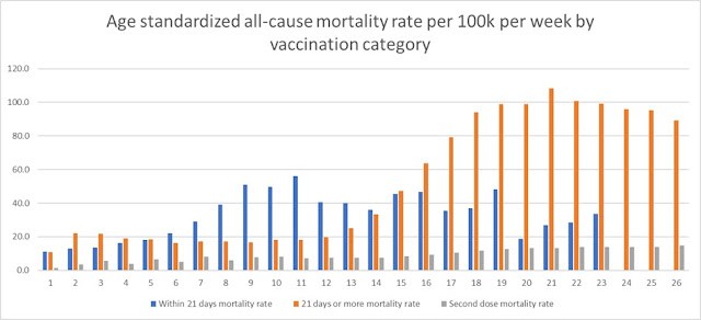 Od 19 marca śmiertelność po podaniu podwójnej dawki wzrastała z tygodnia na tydzień mniej więcej konsekwentnie. Śmiertelność u osób powyżej 21 dni po podaniu pierwszej dawki wzrosła drastycznie na wiosnę (w 14 tygodniu), po czym pozostała wysoka.
