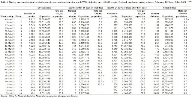 Najnowszy Urząd raporcie Narodowy Statystyki dotyczące umieralności według statusu szczepień Covid dostarcza danych na temat wszystkich zgonów - związanych z Covid i nie związanych z Covid w okresie styczeń-lipiec 2021 dla nieszczepionych i różnymi kategoriami zaszczepione ( "w ciągu 21 dni od pierwszej dawki", „21 dni lub więcej po pierwszej dawce", „po drugiej dawce").