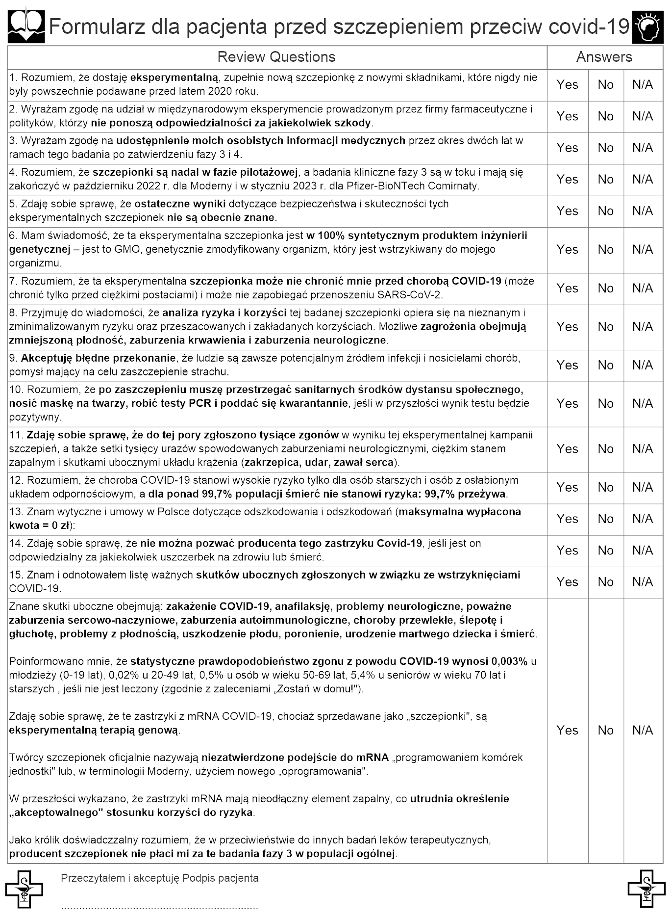 Przeczytałem i zrozumiałem powyższe informacje, wyrażam świadomą zgodę i wyrażam zgodę na dobrowolne otrzymanie eksperymentalnej szczepionki Moderna/Pfizer oraz w pełni zwalniam mojego lekarza z wszelkiej odpowiedzialności cywilnej lub karnej w związku z tym wstrzyknięciem i możliwymi konsekwencjami.